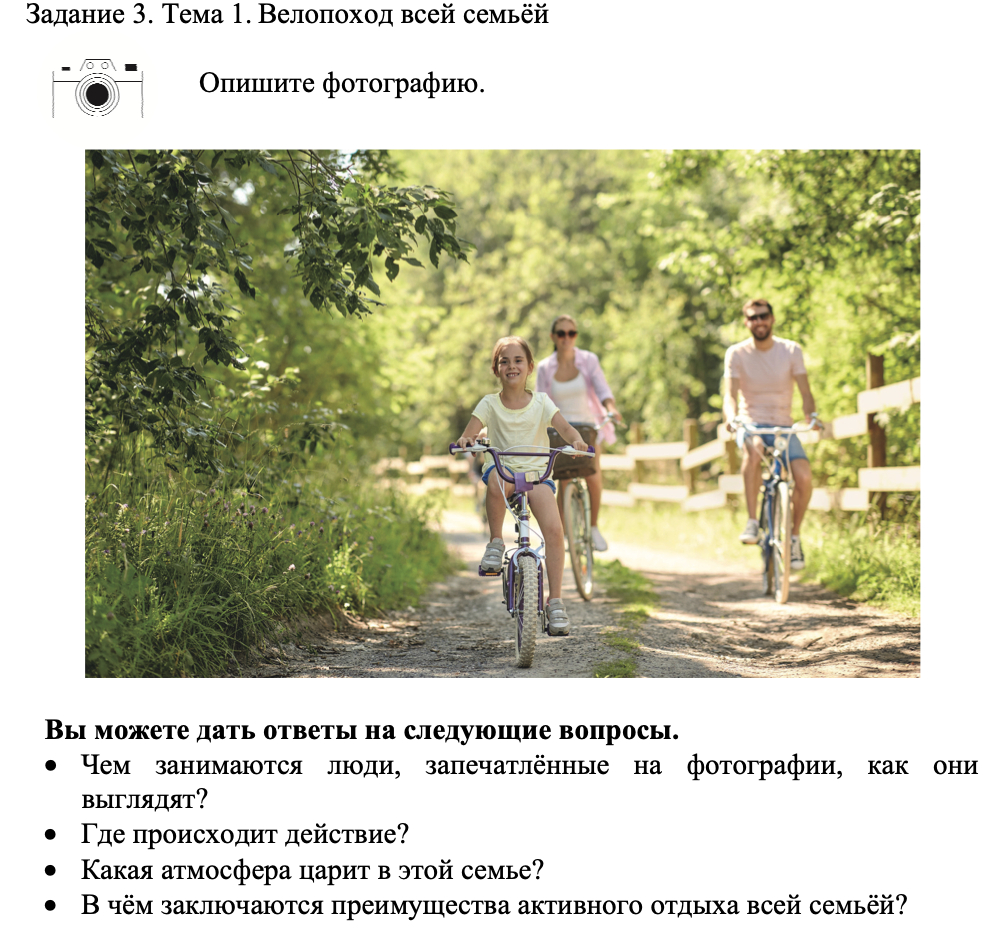 Начинайте монолог с вопроса-ответа: «Кто изображен на фотографии? На ней изображен/изображены…» Затем задавайте вопросы по пунктам карточки. Спросите вслух: «Какая одежда на нем?» — и сами на него ответьте. И так далее по всем вопросам, указанным в КИМ.