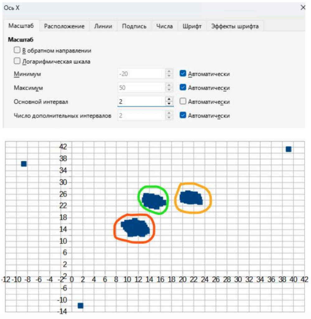 2. Нажимаем ПКМ по оси координат. Во вкладке масштаб меняем основной интервал, например, на 2. Так проделываем с осью X и Y.